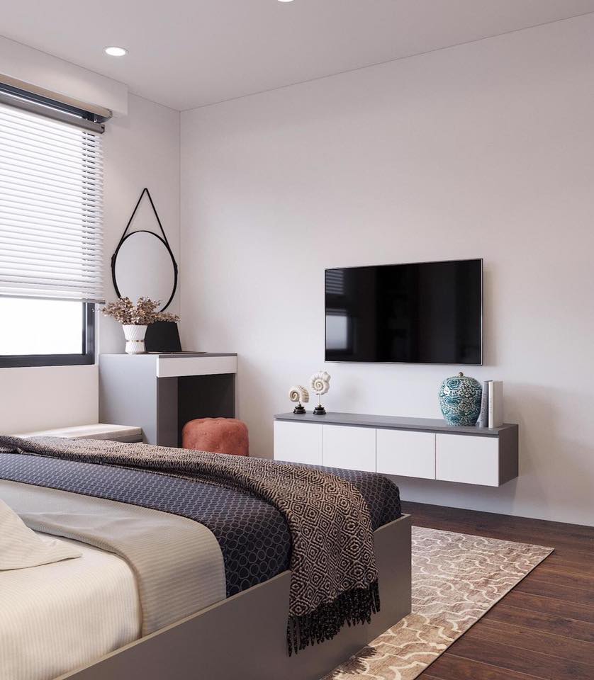 Kệ TV được bố trí đối diện giường cạnh ngoài là bàn phấn bố trí gọn gàng mà vẫn lấy được ánh sáng tự nhiên từ cửa sổ